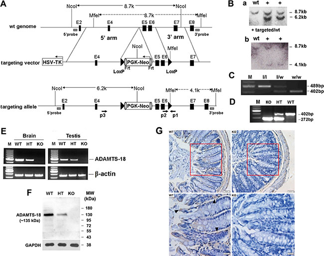Figure 1: Targeted disruption of mouse Adamts18 gene. (A) Schematic illustration of the gene-targeting strategy. In the targeting vector, a Frt (shown as vertical oval) flanked PGK/Neo cassette which was put into the intron upstream of exon5 and exons 5–6 were flanked by two loxP sites (black triangles), and a HSV-TK cassette was introduced in the flanking region of the 5′ arm. Black horizontal bar, linear genomic sequence of the Adamts18 gene; Filled box, exon; HSV-TK, herpes simplex virus thymidine kinase; Frt, flippase recognition target site. (B) Southern blot analysis of genomic DNA from ES cell clones. (a) Genomic DNA from ES cell clones were digested with NcoI and hybridized with a 5′probe located in the flanking region of 5′homologous arm (shown in panel A as gray box). (b) Another Southern blotting with MfeI-digested genomic DNA. (C) Example of PCR genotyping of Adamts18 floxed (l/l), Adamts18 floxed heterozygous (l/w), and WT (w/w) mice with p1 and p2 (shown as opposite arrows in panel A) located in the flanking regions of the introduced loxP downstream of the exon 6. (D) Example of PCR genotyping of Adamts18 knockout (KO), heterozygous (HT), and wild type (WT) mice. (E) RT-PCR analysis for Adamts18 mRNA in brain and testis of WT, HT and KO mice. β-actin was used as internal reference. M, DNA molecular marker. (F) Western blot analysis of Adamts18 protein expression in brain of WT, HT and KO mice. GAPDH was used as the loading control. (G) Immunohistochemical staining. A strong Adamts18 expression was noted in the mucosa (black arrowhead) of WT mouse colon when compared with Adamts18 KO littermates. Scale bar = 50 μm (upper panel) and 20 μm (lower panel), respectively.