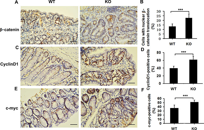 In AOM/DSS–induced CAC, enhanced tumorigenesis is closely associated with aberrant β-catenin signaling pathway [16]. We then examined the association between Adamts18 and β-catenin signaling pathway. Immunohistochemistry staining showed that the number of cells with nuclear β-catenin translocation was significantly increased in Adamts18 KO tumor cells compared to WT tumor cells [cells with nuclear β-catenin translocation (%), WT vs. KO, 13.1 ± 2.9 vs. 22.7 ± 4.3; P = 0.0004] (Figure 4A and 4B). Translocated β-catenin from the cytoplasm to the nucleus may serve as a transcriptional factor to stimulate the expression of its downstream target genes (cyclinD1 and c-myc) and promote colon tumor formation [16]. In line with this views, we found that the numbers of cyclinD1 or c-myc- positive cells were also significantly increased in colon tumors from Adamts18 KO mice in comparison to WT tumor cells [cyclinD1 positive cells (%), WT vs. KO, 39.4 ± 5.4 vs. 61.3 ± 9.5; P = 0.0002; c-myc positive cells (%), WT vs. KO, 36.8 ± 7.4 vs. 51.4 ± 4.5; P = 0.0008] (Figure 4C–4F). Likewise, the results of qRT-PCR showed the expression of its downstream target genes cyclinD1 and c-myc mRNA were significantly increased in the colon cancer cells of Adamts18 KO mice relative to WT littermates (Supplementary Table 2).