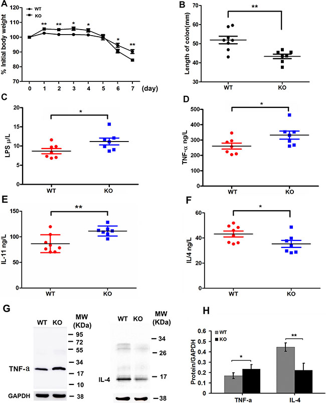 Figure 5: Adamts18 deficient mice are highly susceptible to DSS-induced colitis. DSS colitis model was established in wild-type (WT) mice and Adamts18 knock-out (KO) littermates by administration of 3% DSS solution in drinking water for 7 days. (A) The body weights of the WT and Adamts18 KO mice were monitored during the study period. Weights are expressed as means of individual data relative to initial body weight of each animal. The Adamts18 KO mice suffered from significant body weight loss from day 6. (B) Quantification of colon length of WT and Adamts18 KO mice at time of sacrifice. (C–F) Sera lipopolysaccharides (LPS) and inflammatory cytokine assay. Concentrations of LPS (C), tumor necrosis factor-alpha (TNF-α) (D), interleukin (IL)-11 (E), and IL-4 (F) determined by sandwich ELISA. Each symbol represents one individual. Horizontal bars represent mean value. (G–H) Western blot analysis of the expression level of TNF-α and IL-4 in mice colitis tissues. Columns mean; bars, SD (*P < 0.05, **P < 0.01). These experiments are repeated independently at three times.