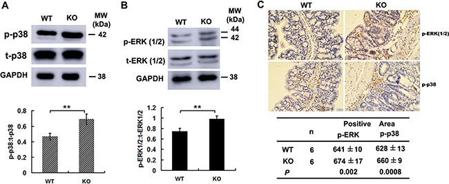 Figure 6: Increased p38MAPK and ERK1/2 activities in colon cancer cells of Adamts18 deficient mice. (A–B) Western blot analysis of the activities of p38 MAPK (A) and ERK1 ⁄ 2 (B) in tumor tissues of mice. (C) Immunohistochemical analysis of the activities of ERK1⁄2 and p38MAPK in tumor tissues of mice. Brown, positive staining. The positive staining was calculated statistically using Image Pro Plus 6.0 software (Media Cybernetics Inc., Bethesda, MD, USA). Results are mean ± SD, **P < 0.01. Scale bar = 20 μm. These experiments are repeated independently at three times. WT, wide-type; KO, knock-out.