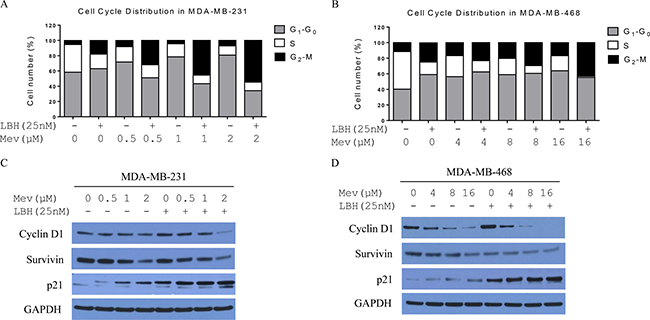 Statins inhibit cancer cell proliferation by arresting the cell cycle at G1-S phase and inducing apoptosis via both mevalonate-dependent pathway and -independent pathways [26]. We performed cell cycle analyses via flow cytometry. Mevastatin treatment in MDA-MB-231 cells increased the percentage of cells in G1-G0 phase from 58% to 81% after 24 h in a dose-dependent manner, and decreased cells in S phase. Treatment with LBH589 (25 nmol/L) for 24 h decreased the percentage of S phase cells from 36% to 16%, and increased cells in G1-G0 and G2-M phases. Combination treatment in MDA-MB-231 cells increased G2-M phase arrest from 5% to 55% after 24 h in a mevastatin dose-dependent manner, and decreased cells in S and G1-G0 phases (Figure 2A). A similar cell cycle distribution was observed in MDA-MB-468 cells (Figure 2B): 24-hour treatment with both mevastatin and LBH589 enhanced G2-M phase arrest (from 12% to 43%) and reduced cells in S and G1-G0 phases. Cell cycle proteins were analyzed by Western blotting. 24 h combination treatments in MDA-MB-231 and MDA-MB-468 cells downregulated cyclin D1 and survivin, and upregulated p21 in a mevastatin dose-dependent manner (Figure 2C–2D).