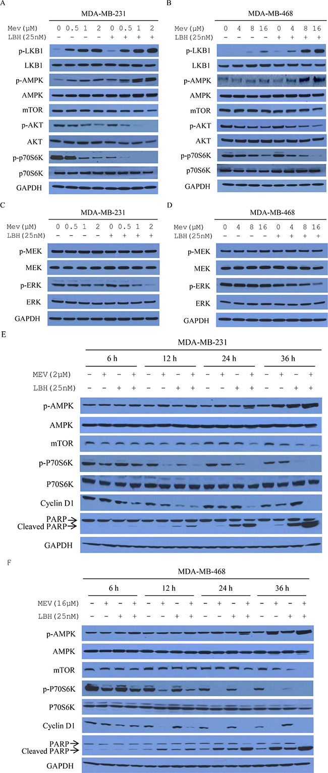 Figure 4: Mevastatin and LBH589 activate AMPK and inhibit mTOR in TNBC cell lines. AMPK involvement in the synergistic effects of mevastatin and LBH589 on MDA-MB-231 (A) and MDA-MB-468 (B) cells for 24 h. Cell lysates were immunoblotted with indicated antibodies. Co-treatment effect on ERK does not depend on Ras in MDA-MB-231 (C) and MDA-MB-468 (D) cells after 24 h. Cell lysates were analyzed by Western blotting for phosphorylated or total MEK, phosphorylated or total ERK, with GAPDH as an internal control. MDA-MB-231 (E) and MDA-MB-468 cells (F) were treated with mevastatin plus LBH589 for 6, 12, 24 and 36 h. Lysates were immunoblotted with the indicated antibodies.
