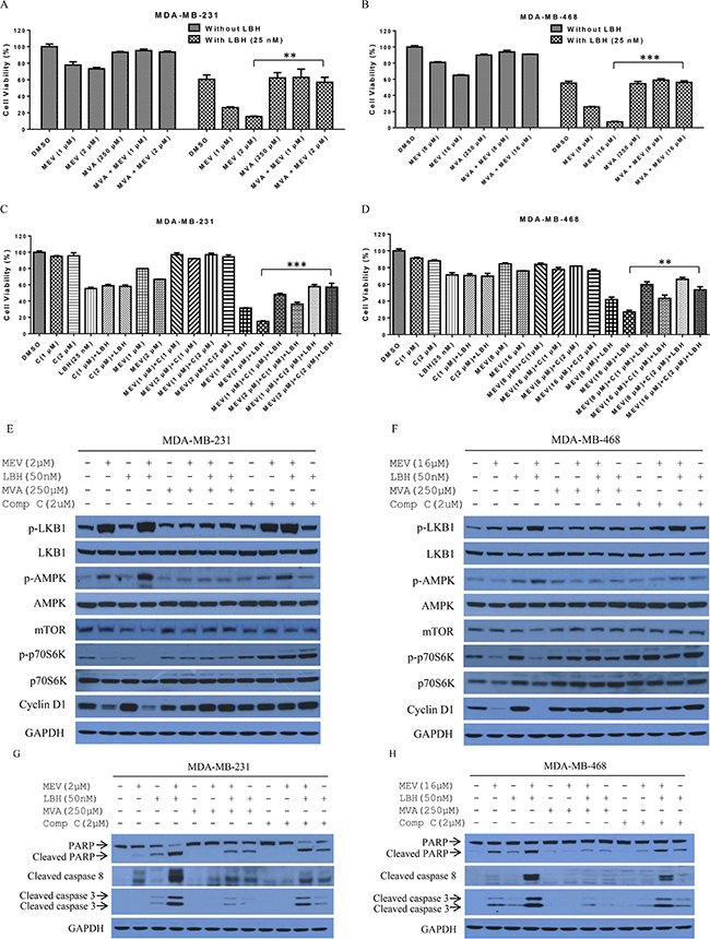 Figure 5: The mevalonate pathway is involved in mevastatin enhancement of LBH-induced TNBC cell death. Mevalonate and compound C rescued mevastatin-induced proliferation inhibition in MDA-MB-231 and MDA-MB-468 cells. Prior to mevastatin and/or LBH589 (25 nM) treatment for 48 h, MDA-MB-231 (A) and MDA-MB-468 (B) cells were incubated with or without mevalonate (250 μM) for 6 h. Alternatively, prior to treatment, MDA-MB-231 (C) and MDA-MB-468 (D) cells were incubated with or without compound C (1, 2 μM) for 2 h. Mevalonate and compound C blocked LKB1/AMPK signaling in MDA-MB-231 (E) and MDA-MB-468 (F) cells treated with indicated agents for 24 h. Cell lysates were immunoblotted with indicated antibodies. Mevalonate and Compound C reduced cleavage of apoptosis-related proteins in MDA-MB-231 (G) and MDA-MB-468 (H) cells. Cleavage of PARP, and caspases 8 and 3 was analyzed by Western blotting. Data are representative of at least three experiments. Student’s t-test. **P < 0.01; ***P < 0.001.