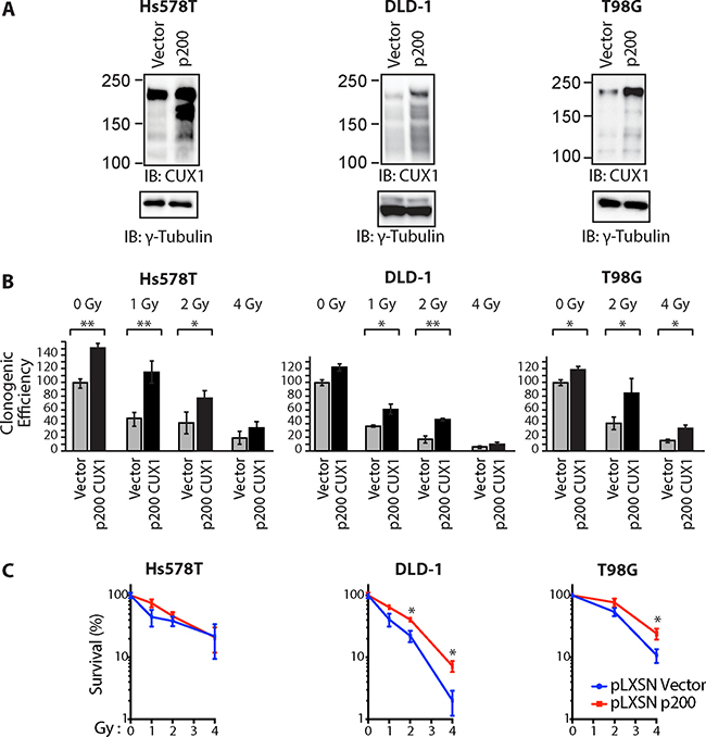 To investigate whether higher CUX1 expression would increase resistance to radiation, we established populations of Hs578T, DLD-1 and T98G tumor cells stably carrying either a retroviral vector expressing p200 CUX1 or an empty vector (Figure 2A). Ectopic expression of p200 CUX1 increased clonogenic efficiency following irradiation in the three tested tumor cell lines (Figure 2B). However, as p200 CUX1 increased clonogenic efficiency of non-irradiated cells, the results were also expressed relative to that of non-irradiated cells (Figure 2C).