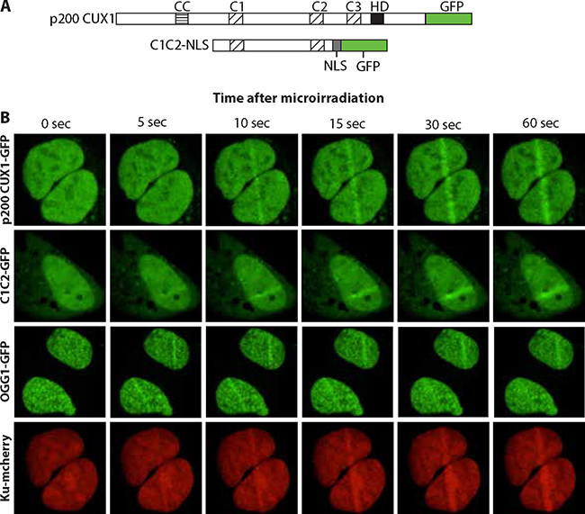 To confirm recruitment of CUX1 to DNA damage, we performed similar assays using 405 nm laser irradiation. In parallel, we also expressed another GFP fusion protein that only contained CUT domains 1 and 2 of CUX1, C1C2. A nuclear localization signal (NLS) was added to enable nuclear localization in the absence of the Cut homeodomain (Figure 4A). Both p200 CUX1-GFP and C1C2-GFP proteins were rapidly recruited to the focal regions of induced DNA damage (Figure 4B; see Supplementary Movies 2 and 3). These results established that CUT domains are sufficient for rapid recruitment to DNA damage. Importantly, similar experiments using cells expressing OGG1-GFP and Ku-mcherry show that the two proteins were recruited to the micro-irradiated region, thereby establishing that both double-strand break and oxidized base DNA lesions were produced using these micro-irradiation conditions (Figure 4B; see Supplementary Movies 4 and 5).