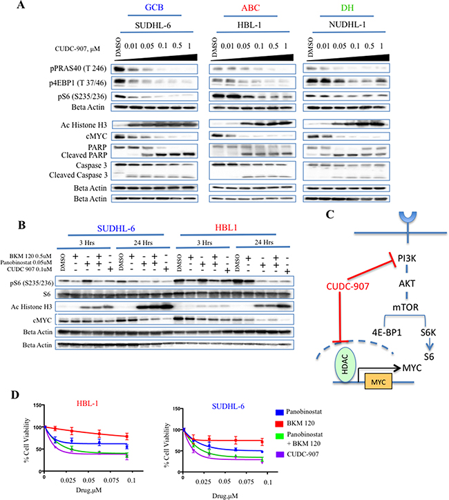 Figure 2: CUDC-907 inhibits c-Myc and HDACs in DLBCL cell lines. (A) Western blot analysis demonstrating the effect of increasing concentration of CUDC-907 (from 0.01 to 1 μM) on PI3K downstream targets (p4EBP1, pPRAS40 and pS6) and histone H3 acetylation (Ac Histone H3). The actual inhibition of PI3K and HDAC resulted in a decrease in c-Myc protein levels. Activation of caspase 3 and PARP was present as well. (B) Western blot analysis showing the effect of single agent PI3K inhibitor (BKM-120), HDAC inhibitor (panobinostat), or both on PI3K and HDAC targets. The data show that CUDC-907 produces similar results to the combination of BKM-120 and panobinostat. (C) CUDC-907 combines PI3K and HDAC inhibitor into a single scaffold, and therefore is capable of disrupting the oncogenic cooperation between PI3K and c-Myc. (D) MTS assay demonstrating that CUDC-907 inhibits cell proliferation, mimicking the effect of BKM-120 plus panobinostat. Cells were incubated with increasing concentrations of BKM-120, panobinostat and CUDC-907, and viability assessed after 24 hours.