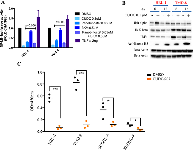 Figure 4: CUDC-907 inhibits NF-kB signaling in ABC DLBCLs. (A) Relative NF-kB-luciferase activity in two representative ABC DLBCL cell lines (HBL-1 and TMD-8). Cells were treated for 12 hours with indicated concentration of either panobinostat, BKM-120, the combination of these two drugs, CUDC-907 or DMSO. Cells were incubated with 2 ng of TNF-α as positive control for NF-kB activation. Error bars represent standard error of the mean (S.E.M) of triplicate experiments. (B) Western blot demonstrating that CUDC-907 (0.1 μM for 6 and 12 hours) inhibits NF-kB activation by increasing IkB alpha levels and decreasing IKK beta levels in two representative ABC DLBCL cell lines (HBL-1 and TMD-8). The changes were associated with a decrease in IRF4 levels (see Supplementary Figure 2B). (C) ELISA assay showing a more pronounced decrease of nuclear NF-kB p65 in two representative ABC (HBL-1 and TMD-8) cell lines compared with two GCB (SUDHL-6 and SUDHL-4) treated with either 0.1 μM CUDC-907 or DMSO for 12 hours. Differences between groups were calculated with the Student's t test. *p < 0.05; ***p < 0.001.
