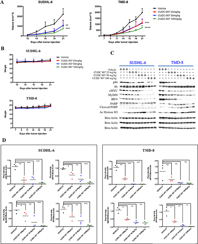 Figure 5: CUDC-907 therapy in xenograft model of GCB and ABC DLBCL. (A) Human SUDHL-6 and TMD-8 DLBCL cells were established as s.c. tumors in NOD/SCID mice and treated orally with vehicle (n = 8) or CUDC-907 at 25 (n = 8), 50 (n = 8) and 100 (n = 8) mg/kg, 5 times weekly. CUDC-907 inhibits tumor growth in a dose-dependent manner when compared with the control group. Tumor volume was measured 3 times per week. Differences between groups were calculated with the Student's t test. **p < 0.005; ***p = 0.0001; ****p < 0.00001. (B) Variations of body weight over time in SUDHL-6 and TMD-8 xenografts treated with CUDC-907 at 25, 50 and 50 mg/kg. (C) In vivo effects of CUDC-907 on pS6, c-Myc, MyD88, IRF4, PARP and acetyl histone H3 levels in SUDHL-6 and TMD-8 xenografts after 24 hours from the last drug administration. Proteins were extracted from tumor tissues and analyzed by western immunoblotting to assess in vivo inhibition of indicated targets. (D) Scatterplots summarizing changes in expression levels of pS6, c-Myc, MyD88 and IRF4, expressed as ratios of pixel densities between actin and protein of interest. Densitometry was performed by using the ImageJ software. Differences between groups were calculated with the Wilcoxon Rank test. *p < 0.05; **p < 0.01; ***p < 0.001; ns, not significant.