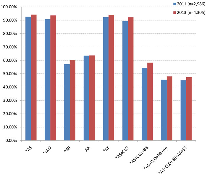 Figure 1: Percentage of drug use during hospitalization. *: P < 0.05 compared with 2011. AA, ACEI/ARB; AS, aspirin; BB, β-blocker; CLO, clopidogrel; ST, statin.