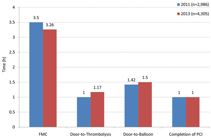 The approach of patient administration was analyzed to understand the transportation mechanism, treatment options and social burden. For patient transportation, the rates of using ambulances and taxis/private cars were 39.89% and 60.11% in 2011 and 39.93% and 60.07% in 2013, respectively (P = 0.98). In year 2011 and 2013, the emergency management measures did not differ significantly. PCI was the most commonly performed measure (46.12% and 43.39%), followed by the conservative therapy (42.06% and 43.16%), only 11.82% and 13.45% of patients underwent emergency thrombolysis. For the time point of intervention, there was no significant shortening in onset-to-FMC time (median, 3.5h vs. 3.26h), door-to-thrombolysis time (median, 1.00h vs. 1.17h), door-to-balloon time (median, 1.42h vs. 1.5h), and the time for completion of PCI (median, 1.00h vs. 1.00h) from 2011 to 2013 (Figure 2). The recanalization rate of PCI in year 2013 was, however, significantly improved compared to year 2011 (Table 3).