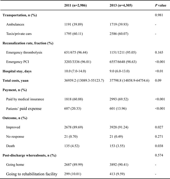 Compared to year 2011, patients with AMI had shorter hospital stay (median, 9 vs. 10 days), without changes in the total medical cost (median, ¥36939.2 vs. ¥37798.8) in 2013. There was a notable change in the structure of payment, with an increased payment from the health insurance (from 60.88% to 69.52%) and a reduced payment from the patients (from 20.33% to 13.96%). There were less in-hospital deaths in 2013 than in 2011 (3.55% vs. 4.52%, P = 0.038). The majority of patients chose to go home after discharge (89.99% in 2011 vs. 90.41% in 2013) other than going to rehabilitation facility for further therapy (10.01% in 2011 vs. 9.59% in 2013, Table 3).