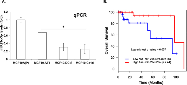 Figure 2: miRNA-29c is lost during TNBC progression and its low levels predict poor survival in basal-like breast cancer patients. A. miRNA-29c-3p levels were measured by Taqman-based qPCR analysis in an MCF10A-based TNBC progression model. miRNA-29c-3p levels were normalized to RNU44 control. B. Kaplan-Meier curve showing overall survival (in months) in basal-like breast cancer patients expressing low vs high levels of miRNA-29c. *p<0.05.