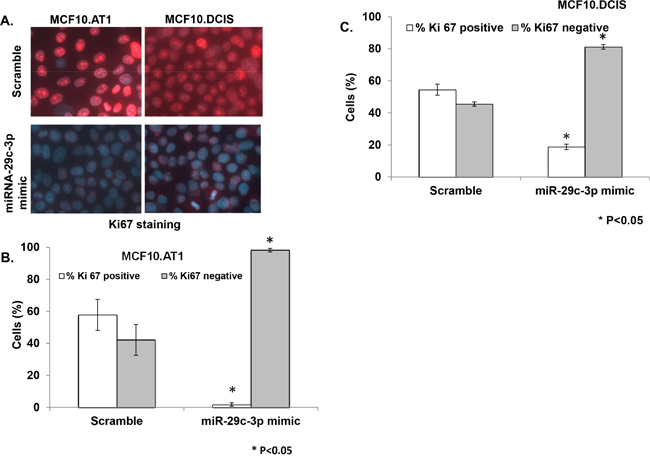 Figure 3: miRNA-29c-3p inhibits cell proliferation in TNBC preneoplastic and DCIS cells. A. Ki67 immunostaining followed by immunofluorescence in MCF10.AT1 and DCIS cells that were transfected with miRNA-29c-3p mimic or scramble control mimic. Red color foci within the DAPI-stained blue nuclei indicate Ki67. B, C. Bar diagrams show the quantification of highly proliferative cells expressing 3 or more Ki67 foci (Ki67 positive) and minimally proliferative cells expressing 0-2 Ki67 foci (Ki67 negative) in the nuclei of MCF10.AT1 cells and MCF10.DCIS cells. * p<0.05.