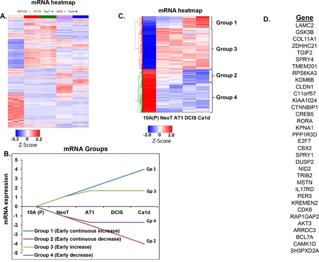 To understand how miRNA-29c potentially affects the cell proliferation and colonizing ability of preneoplastic and DCIS cells, we focused on identifying its functional gene pairs and turned to our next-generation RNA sequencing data from the MCF10A breast cancer progression panel. First, we looked for any global patterns of mRNA expression during breast cancer progression. Mining of these sequencing results show that even at gene level a multitude of the gene alterations (more than 80%) occur during the normal to preneoplastic transition during breast cancer development, suggesting that molecular determination of cell fate occurs early on in the process of TNBC development (Figure 5A and 5C).