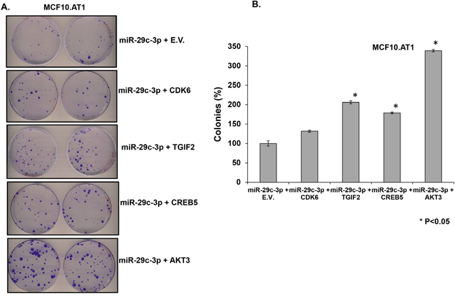 Figure 8: TGIF2, CREB5, and AKT3 overexpression reverts the inhibition in colony formation caused by forced expression of miRNA-29c-3p in TNBC preneoplastic cells. A. Methylene blue-stained colonies formed by MCF10.AT1 cells after 12 days of transfection with miRNA-29c-3p mimic in combination with TGIF2, CREB5, AKT3, CDK6, or empty expression vector (E.V.). B. Quantification of colonies formed by MCF10.AT1 cells transfected with the miRNA-29c mimic in combination with TGIF2, CREB5, AKT3, CDK6, or empty expression plasmid. Cell colonies possessing more than 50 cells were counted as clones. * p<0.05.