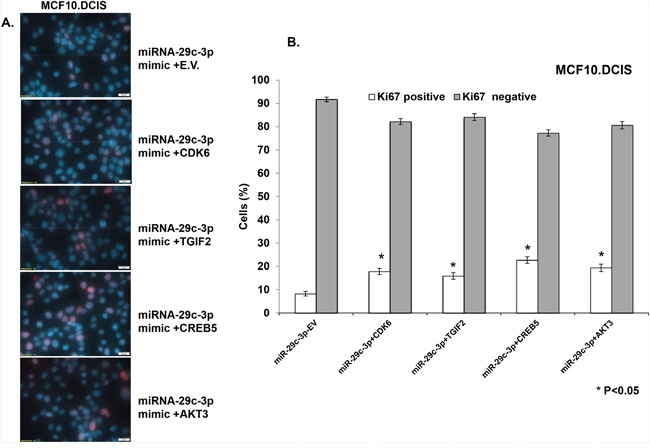 Figure 9: TGIF2, CREB5, and AKT3 overexpression only partially reverts the inhibition in cell proliferation caused by forced expression of miRNA-29c-3p in MCF10.DCIS cells. A. Immuno- fluorescence images showing the cell proliferation marker Ki67 (indicated by red nuclear stain within the DAPI-stained nucleus) in MCF10.DCIS cells transfected with miRNA-29c-3p mimic in combination with TGIF2, CREB5, AKT3, CDK6, or empty expression vector (E.V.). B. Bar diagrams show the quantification of highly proliferative cells expressing 3 or more Ki67 foci (Ki67 positive) and minimally proliferative cells expressing 0-2 Ki67 foci (Ki67 negative) in the nuclei of MCF10.DCIS cells. * p<0.05.