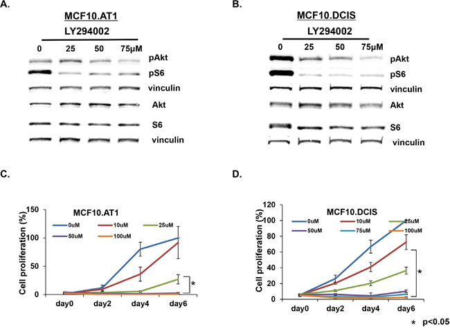 Figure 10: AKT-mTOR pathway targeting inhibits cell proliferation in MCF10.AT1 and MCF10.DCIS cells. A, B. Western blots showing total and phosphorylated endogenous protein levels of AKT-mTOR pathway in vehicle- or LY294002-treated MCF10.AT1 and MCF10.DCIS cells. The cells were treated with the indicated concentrations of LY294002 for 24 hrs. C, D. MTT assay showing inhibition in cell proliferation of MCF10.AT1 and MCF10.DCIS cells by the PI3K inhibitor LY294002 for the indicated days and concentrations. * p<0.05.