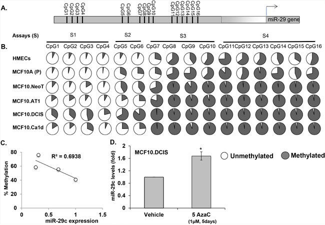 Figure 11: Methylation of miRNA-29c correlates with its expression during the spectrum of TNBC progression and its demethylation reverts the expression of miRNA-29c. A. Schematic diagram of the miRNA-29c gene promoter showing the location of CpG sites. B. Percent of methylation level at each CpG site in the miRNA-29c gene promoter determined from genomic DNA obtained from an MCF10A-based TNBC progression model by pyrosequencing. The data are averages of methylation levels from 2 different cell passages. C. Correlation analysis showing an inverse correlation between expression of miRNA-29c and average percent methylation level of 16 CpGs in the promoter during TNBC progression. D. Taqman-based real-time PCR analysis of MCF10.DCIS cells treated with the DNA demethylation drug 5-aza cytadine at a 1 μM concentration for 5 days to measure miRNA-29c-3p levels that were normalized to RNU44 control.
