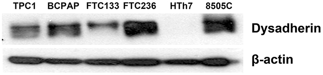 Total cellular proteins were isolated from all six human thyroid cancer cell lines as previously described [47]. Protein concentrations were quantified by BCA Protein Assay Kit (Thermo Scientific, Waltham, MA). Denatured proteins (20μg) from each sample were resolved by gel electrophoresis (Bio-Rad Laboratories) and transferred to nitrocellulose membranes (Bio-Rad Laboratories). Protein-bound membranes were blocked in 5% nonfat milk solution and incubated with dysadherinmAb NCC-M53 antibodies, diluted 1:1000, overnight at 4°C. The next day, the nitrocellulose membranes were washed and incubated for 1 hour at room temperature with horseradish peroxidase-conjugated secondary antibodies (Cell Signaling Technology, Beverly, MA). Immunoreactive protein bands were detected by Immunstar (Bio-Rad Laboratories).
