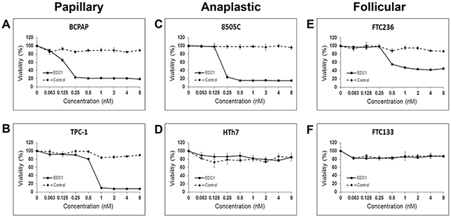 Figure 4: EDC1, an antibody-drug conjugate that target dysadherin, inhibits thyroid cancer cell proliferation. The papillary A and B. anaplastic C and D. and follicular E and F. thyroid cancer cell lines were treated with EDC1 (0-8nM) and negative control, the warhead drug conjugated to a non-specific antibody, for 72 hours. Cell viability was measured by a 3-(4,5-dimethylthiazol-2-yl)-2,5-diphenyltetrazolium bromide (MTT) assay. The data was presented in mean percent viability ± SEM.