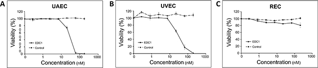 When human umbilical artery endothelial cell line (UAEC), umbilical vein endothelial cell line (UVEC), and renal epithelial cell line (REC) were treated with EDC1 in the same manner (Figure 5), very limited cytotoxicity was observed (EC50 = 52nM, 37nM, >100nM respectively) with the EC50 much higher compared to those of the thyroid cancer cell lines. Taken together, these results suggest that EDC1 is more potent against thyroid cancer cells than against non-cancerous cells.