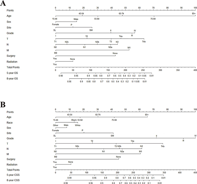 MSGC is a rare but histologically diverse entity that represents 23 separate primary salivary gland malignant tumors [24]. Although exposure to Ionizing radiation has been reported as a potential causative factor in MSGC development, the specific underlying etiological factors remain unclear [25]. Therefore, the establishment of treatment-related decisions and follow-up strategies for patients with MSGC is challenging but urgently needed. Nomogram is a statistical tool that can meet these requirements. To date, there is no well-designed nomogram for MSGC based on international database. Using the population-based SEER database with a mean follow-up of 34 months, we developed nomograms for predicting five- and eight-year OS and CSS in individual patients with MSGC by applying competing risks analysis.