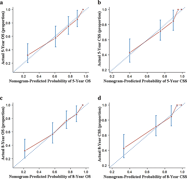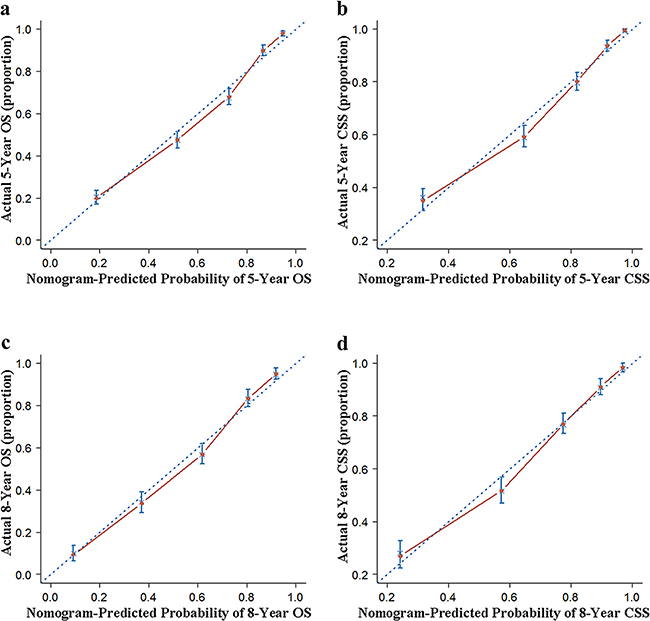 Figure 2: Internal calibration of the nomogram. a. 5- and c. 8-year overall survival (OS) nomogram calibration curves; b. 5- and d. 8-year cancer-specific survival (CSS) nomogram calibration curves. The dotted line represents the ideal match between the nomogram-predicted (X-axis) and actual survival (Y-axis). Vertical bars indicate 95% confidence intervals.
