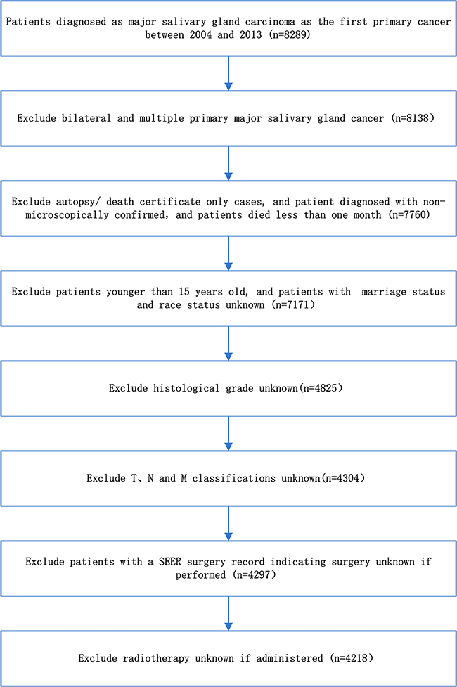 We identified information on the clinical and pathologic characteristics of all patients diagnosed with major salivary gland carcinoma between 2004 and 2013 from the SEER program of the National Cancer Institute, which is a national collaboration program [9]. The flow diagram of data selection is shown in Figure 4. Briefly, the basic inclusion criteria were as follows the primary tumor site was major salivary gland, including the parotid, submandibular, and sublingual glands; malignant behavior; and age older than 15 years at diagnosis. To improve the accuracy and homogeneity of the SEER cohort, the final inclusion criteria were as follows: diagnostic information confirmed microscopically and not from a death certificate or autopsy only; active follow-up; patient and tumor information (age, race, sex, marital status, tumor site, tumor laterality, tumor grade, surgery performed, radiation therapy and TNM classifications) were known and exact. A total of 4017 patients were excluded due to indefinite follow-up information or because patients died less than 1 month after treatment. After applying the screen criteria, 4218 patients were included in the final SEER cohort.