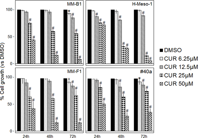 Figure 1: Effect of CUR on MM cell lines survival. The survival of human (MM-B1, H-Meso-1, MM-F1) and mouse (#40a) cell lines was assessed by the SRB assay after 24, 48 and 72 hours of treatment with DMSO or CUR. The percentage of surviving cells treated with the compound was calculated by normalizing the O.D. value to that of the control cultures (DMSO). The results are expressed as the means ± SD of three independent experiments performed in triplicate (xp ≤ 0.05, *p ≤ 0.01, #p ≤ 0.001 compared with the cultures treated with DMSO).