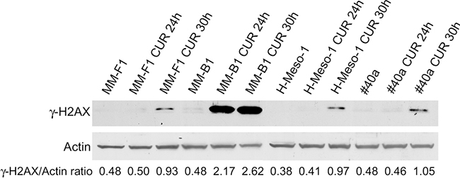 Figure 2: Effect of CUR on DNA damage in MM cells. The expression of γ-H2AX was assessed by western blotting in MM cell lines treated with CUR at 25 μM or with DMSO for 24 and 30 hours. Actin was used as an internal control. The intensity of the bands was quantified using the ImageJ software after blot scanning of two independent experiments. The densitometric ratios between γ-H2AX and actin are reported.
