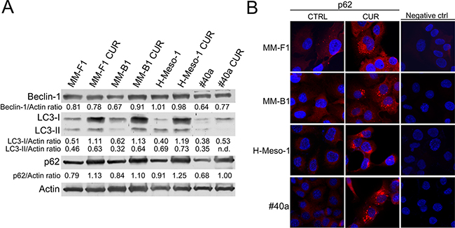 Figure 3: Effect of CUR on the autophagic flux in MM cells. Panel A. The expression of Beclin-1, LC3-I and LC3-II, and p62 was assessed by western blotting in MM cell lines treated with CUR at 25 μM or DMSO for 24 hours. Actin was used as an internal control. The intensity of the bands was quantified using the ImageJ software after blot scanning of two independent experiments. The densitometric ratios between Beclin-1 and actin, LC3-I and actin, LC3-II and actin, p62 and actin are reported. Panel B. The expression of p62 after treatment with CUR in MM cells was determined by immunofluorescence analysis. Cells were fixed after treatment, and incubated with the anti-p62 antibody. After two washes with PBS, cells were incubated with the secondary Alexa fluor-594-conjugated goat anti-rabbit IgG antibody. Nuclei were stained with Hoechst. Original magnification x400. n.d= not detectable.