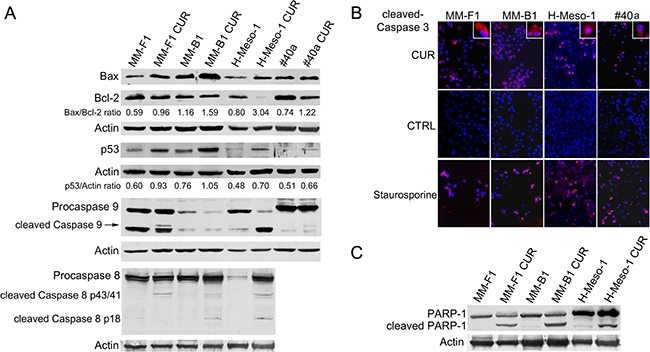 Figure 4: Effect of CUR on apoptosis in MM cells. Panel A. The expression of Bax, Bcl-2, p53, procaspases (9 and 8) and caspases (9 and 8) was assessed by western blotting analysis in MM cells treated for 24 hours with CUR at 25 μM or with DMSO as vehicle. Actin was used as an internal control. The intensity of the bands was quantified using ImageJ software after blot scanning, obtained from two independent experiments. The densitometric ratios between Bax and Bcl-2, and between p53 and actin are reported. Panel B. The expression of active caspase 3 in MM cells treated with CUR at 25μM for 24 hours was determined by immunofluorescence analysis. Cells were fixed after treatment and incubated with the anti-cleaved caspase 3 antibody. After two washes with PBS, cells were incubated with the secondary Alexa fluor-594-conjugated goat anti-rabbit IgG antibody. Nuclei were stained with Hoechst. Staurosporine at 1 μM for 16 hours was used as positive control of apoptosis. Original magnification x200 and x400. Panel C. The cleavage of PARP-1 in CUR-treated MM cells. Western blotting was performed on cells treated with a concentration of 25 μM of CUR or the DMSO vehicle for 24 h. Actin was used as an internal control.