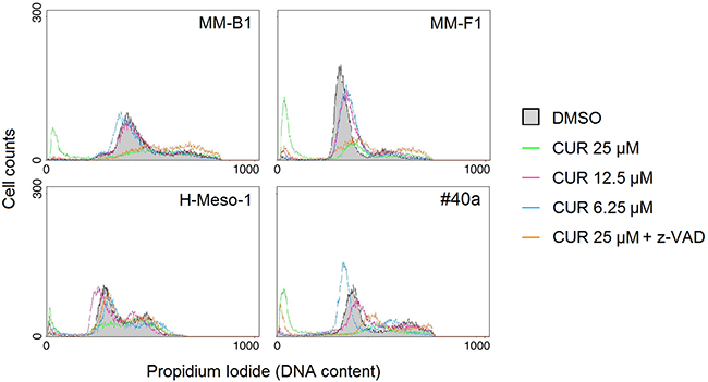 Caspase 3 cleaves poly (ADP-ribose) polymerase-1 (PARP-1) thereby inactivating it and impairing DNA repair and genomic integrity [37]. CUR-mediated cleavage of PARP-1 was determined by western blotting (Figure 4, Panel C). CUR treatment resulted in considerable PARP-1 proteolytic cleavage in all MM cells (Figure 4, Panel C). To further corroborate CUR-mediated apoptosis of MM cells, FACS analysis of DNA content was performed. Figure 5 shows a representative experiment in which the effects of increasing doses of CUR were compared to those obtained with DMSO vehicle only. Our results demonstrate that CUR induced an increase in the percentage of cells in the sub G1 phase in all MM cell lines at the higher dose (Table 3). To confirm the effect of CUR in inducing MM cells apoptosis, MM cells were simultaneously exposed to CUR and to the Z-VAD-FMK, a universal inhibitor of caspases. Z-VAD-FMK was able to significantly reduce CUR-mediated apoptosis in MM-F1 and #40a cells and abolish it in MM-B1 and H-Meso-1 cell lines (Table 3, Figure 5). The increase in the sub G1 phase mediated by CUR was associated to the increase in the G2/M and to the decrease of the G0/G1 phases in all human cell lines. The increase in the sub G1 phase was associated to a decrease of the G0/G1 phase at the dose of 25 μM in the mouse cell line (Table 3).