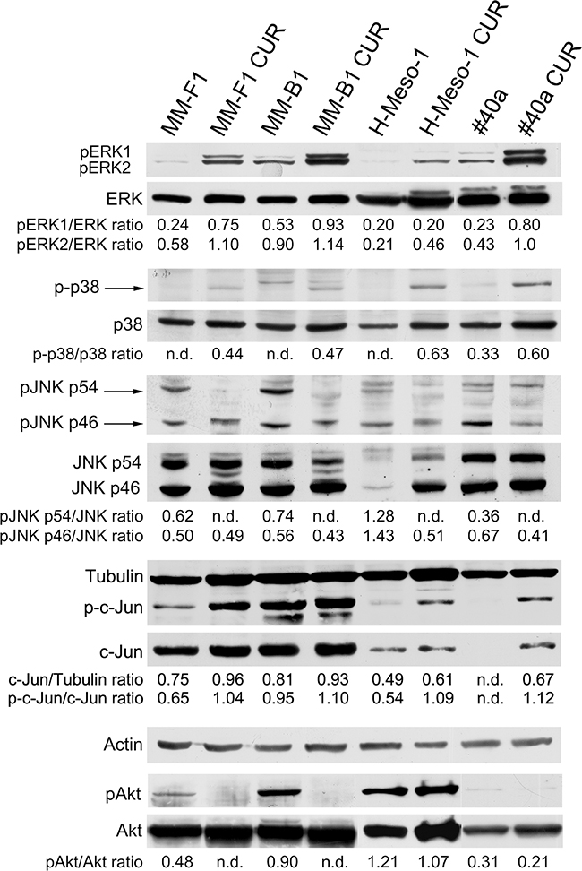 Approximately 1x106 cells were seeded in 100-mm tissue culture dishes 24 hours prior to the addition of 25 μM CUR or vehicle. After 24 hours of incubation, the cells were harvested, washed twice with cold PBS and lysed in RIPA lysis buffer (Triton X-100 1%, SDS 0.1%, NaCl 200 mM, Tris HCl 50 mM pH 7.5, PMSF 1 mM, and NaOV 1 mM). After 30 min at 4°C, the mixtures were centrifuged at 12000 g for 15 min and the supernatants were analyzed by western blotting. For western blotting analysis, 50 μg of cell lysates were resolved in 10% SDS-PAGE and then transferred to nitrocellulose membranes. After blocking, the membranes were incubated with specific primary antibodies at 1-2 μg/ml concentrations overnight at 4°C. After being washed, the filters were incubated with goat anti-mouse or anti-rabbit IgG, peroxidase-conjugated antibodies and developed by chemiluminescence as previously described [78]. A densitometric analysis of autoradiographic bands was performed with Image J software (National Institutes of Health, USA) after blot scanning.