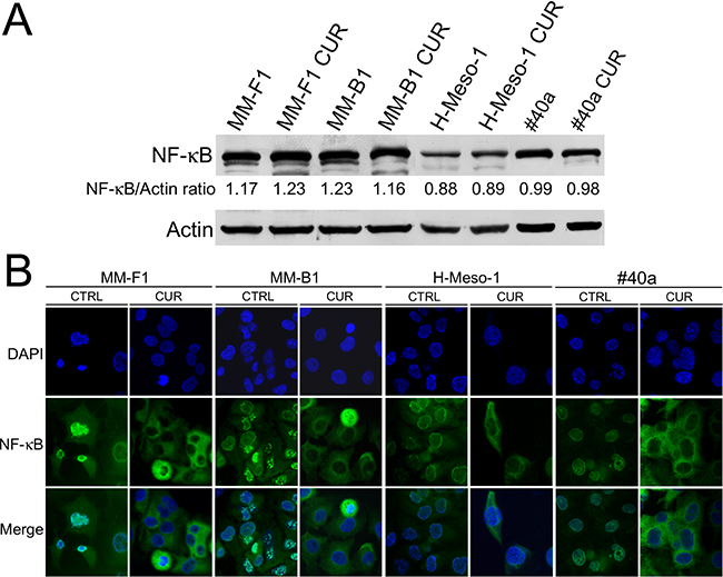 Finally, MM cells were labeled with an anti-activated caspase 3 polyclonal antibody after treatment with CUR (25 μM) or DMSO for 24 hours or, as positive control, with staurosporine (1 μM) for 16 hours. Figure 4, Panel B shows a representative experiment. According to activated caspase 3 positivity, the treatment with DMSO had no effect on the induction of apoptosis in MM-F1 (0.006%), MM-B1 (0.006%), H-Meso-1 (0.004%) and #40a cells (0.007%) (Figure 4, Panel B). Conversely, the percentage of apoptotic CUR-treated cells was 46% for MM-F1 (p<0.001), 29% for MM-B1 (p<0.001), 53% for H-Meso-1 (p<0.001) and 34% for #40a cells (p<0.001). Treatment with staurosporine resulted in apoptotic rates of 85% for MM-F1, 79% for MM-B1, 88% for H-Meso-1 and 81% for #40a cells (Figure 4, Panel B).