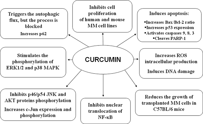 In this report, we explored the in vitro effects of CUR on cell proliferation, cell cycle regulation, pro-survival signaling pathways, apoptosis and autophagy in human and mouse MM cell lines. In addition, we evaluated the in vivo antitumor activities of CUR in C57BL/6 mice intraperitoneally transplanted with mouse MM cells inducing ascites.