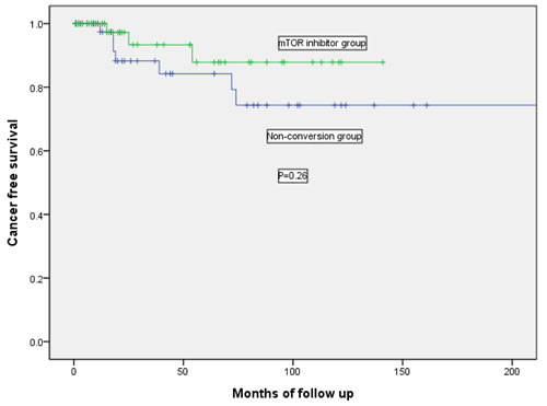 Figure 1: Kaplan-Meier curve showing the cancer free survival in mTOR inhibitor group and non-conversion group.