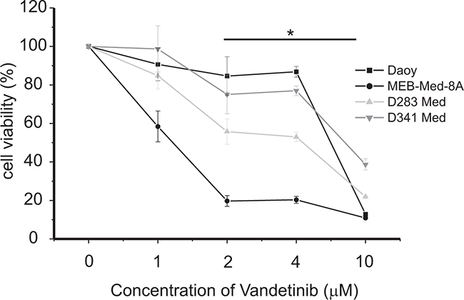 In medulloblastoma Vandetanib reduces cell viability in a dose-dependent manner