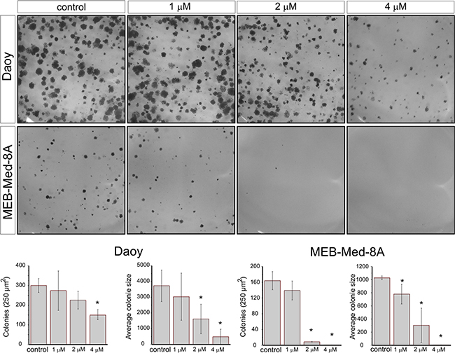 Figure 3: Vandetanib suppresses colony formation of medulloblastoma. Daoy and MEB-Med-8A cells were exposed to 1, 2 and 4 μM Vandetanib for 48h. Subsequently the cells were maintained in standard growth medium for 7 days and colony formation and colony size were assessed. Statistically significant differences from control are marked by an asterisk (*p<0.05). The data shown represent five independent experiments.