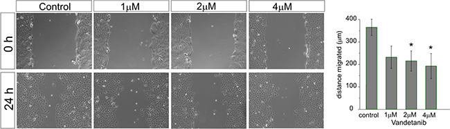 Figure 4: Vandetanib inhibits MB cell migration already at low concentrations. After a single scratch was placed in a confluent monolayer of Daoy cells, cell were exposed to increasing concentrations of Vandetanib for 24h. After 24h each scratch was photographed and its width measured. Migration was determined by comparison of the scratch wound size between 0h and 24h. Statistically significant differences from control are marked by an asterisk (*p<0.05). The data shown represent five independent experiments.