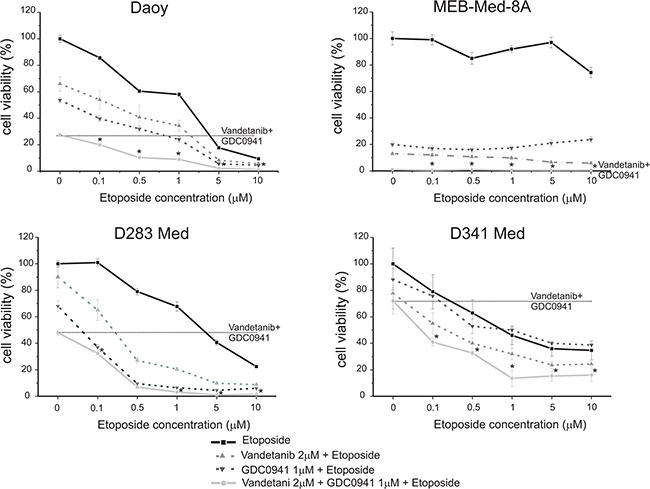 With regards to concomitant application of Vandetanib and GDC-0941 in the SHH-TP53-mutated cell line Daoy we determined in our previous experiments a trend of higher anti-neoplastic efficacy in comparison to single drug application. Here in a cumulative assay determining anti-proliferative and cytotoxic drug effects by means of the metabolic state of the residual cell population this trend could be confirmed. Furthermore, we posed the question, whether inhibition of receptor tyrosine kinases and their downstream signaling molecules could enhance medulloblastoma standard treatment regimes. We treated the investigated cell lines therefore concomitantly with Vandetanib and GDC-0941 in the presence of the chemotherapeutic Etoposide. Indeed, in the SHH-TP53-mutated cell line Daoy as well as in the MYC-amplified cell lines D283 Med and D341 Med the application of the Vandetanib-GDC-Etoposide combination augmented the cytotoxic effect regardless of the applied concentration of Etoposide in comparison to single or dual drug application. In detail, in Daoy and D283 Med at 1 and 5 μM of Etoposide respectively the concomitant application of Vandetanib, GDC-0941 and Etoposide resulted in complete loss of viable cells while in D341 Med at Etoposide concentrations of 1 and 5 μM residual cell viability plateaued 13.6±6 and 15.3±4% respectively. Applying higher Etoposide concentrations in combination with the applied kinase inhibitors did not lead to further enhancement of anti-neoplastic efficacy. In line with above described Etoposide resistancy of MEB-Med-8A concomitant application of Vandetanib and GDC-0941 was sufficient to reduce cell viability completely.