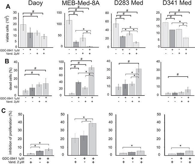 Figure 5: Determination of anti-proliferative and cytotoxic effects of Vandetanib in combination with the PI3K inhibitor GDC-0941. Medulloblastoma cells were treated with 2 μM of Vandetanib or 1 μM of the PI3K inhibitor GDC-0941 alone or in combination for 48h. Viable cell number A. cell death B. and inhibition of proliferation C. was analysed by flow cytometry following a CFSE/Hoechst 33258 stain. DMSO was used as control. Inhibition of proliferation was normalized to control DMSO and all stated values differ significantly (p<0.05) from the control DMSO. Other values tagged with a hashsign also differ significantly from the control (#p<0.05), while all values tagged with an asterisk differ significantly from single drug application (*p<0.05). The data shown represent four independent experiments.