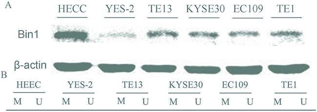 Figure 2: Expression and methylation status of Bin1 in five human esophageal cancer cell lines and human normal esophageal epithelial cells (HEECs). A. Protein expression of Bin1 in esophageal cancer cell lines and HEECs detected by western blot. B. The methylation status of Bin1 detected by MSP analysis in various cancer cell lines and HEECs. M for methylated, U for unmethylated.