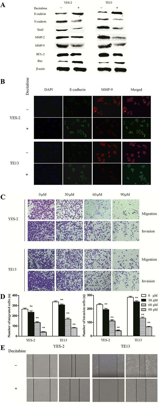 Figure 4: DAC-induced Bin1 de-methylation on migration, invasion and EMT of TE-13 and YES-2 cells. A. The protein level of EMT and invasion related proteins E-cadherin, N-cadherin, Snail, MMP-2, MMP-9 and the protein level of the apoptotic-related proteins, BCL-2 and Bax were detected by western blot. β-actin served as a internal control. B. Immunofluorescence microscopy to identify invasion-promoting molecule MMP-9 and EMT-protective molecule E-cadherin in YES-2 and TE13 cells treated with DAC. C. and D. Effects of DAC in TE-13 and YES-2 cells with different concentrations (0, 30, 60, and 90 μM) on invasion ability exposure for 24 h were investigated using the transwell assay. The number of invading cells was calculated (n = 3). E. Effects of DAC at 90 μM on the migrating ability of TE13 and YES-2 cells after exposure for 48 h were investigated by wound healing assay. ** P < 0.01.