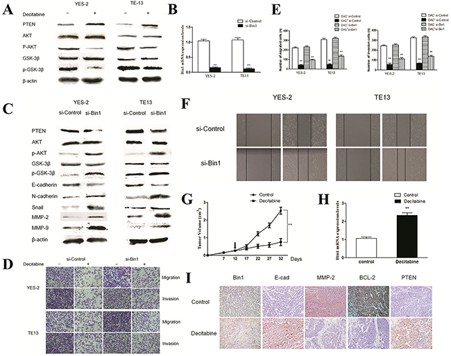 Figure 5: Effects of DAC on PTEN/AKT pathway in TE13 and YES-2 cells. A. Effect of DAC on the PTEN/AKT pathway. YES-2 and TE13 cells were treated with DAC at concentrations of 90 μM. The expression of PTEN, AKT and GSK-3β proteins were detected by western blot. β-actin was used as an internal control. The figures are representative examples of three independent experiments. B. Effect of Bin1-siRNA on the expression of Bin1 mRNA expression in DAC-treated YES-2 and TE13 cells by qRT-PCR. C. Effect of Bin1-siRNA on the expression of PTEN and AKT proteins in DAC-treated YES-2 and TE13 cells. DAC-treated (90 μM) YES-2 and TE13 cells were transfected with Bin1-siRNA. The related proteins were detected by western blot. β-actin was used as an internal control. The figures are representative examples of three independent experiments. D. and E. Effect of Bin1-siRNA on the migration and invasion of DAC-treated YES-2 and TE13 cells. DAC-treated (90 μM) YES-2 and TE13 cells were transfected with Bin1-siRNA. After 48 h, the migration and invasion were observed using a transwell migration assay. The number of invading cells was calculated (n = 3). F. Effect of Bin1-siRNA on wound healing of DAC-treated YES-2 and TE13 cells for 48 h. DAC-treated (90 μM) YES-2 and TE13 cells were transfected with Bin1-siRNA. G. The tumor volume of nude mice with or without DAC. H. The expression level of Bin1 mRNA in nude mice with or without DAC. I. Representative immunohistochemistry images showing expression statuses of Bin1, E-cadherin, MMP2, BCL-2 and PTEN in tumor tissues of nude mice received different treatment (×200). ** P < 0.01.