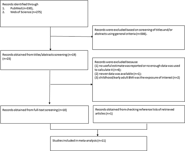 A total of 3403 records were identified after the search of the databases. After the title and abstract screening, 3380 records which did not meet the pre-specified inclusion criteria were excluded. After the full-text screening, 12 articles [14-25] did not meet the inclusion criteria, of which nine [14-22] did not have useful estimate, two [23, 24] used childhood/early adult BMI as the exposure of interest, and one [25] was an updated study. Moreover, we identified one additional publication were after manually searching the reference lists of selected studies [8]. Finally, a total of 11 publications [3-13] were included in present meta-analysis(Figure 1).