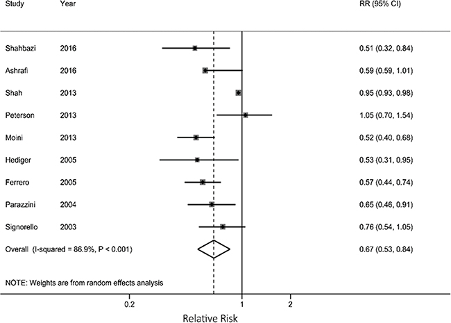 As shown in Figure 2, the overall analysis showed a 33% reduction in the risk of endometriosis for each 5 kg/m2 increase in BMI (RR=0.67; 95% CI: 0.53, 0.84), with statistical significant heterogeneity across the studies (P <0.001, I2 =86.9%). No indication of publication bias was detected by Begg’s test (P = 0.602).