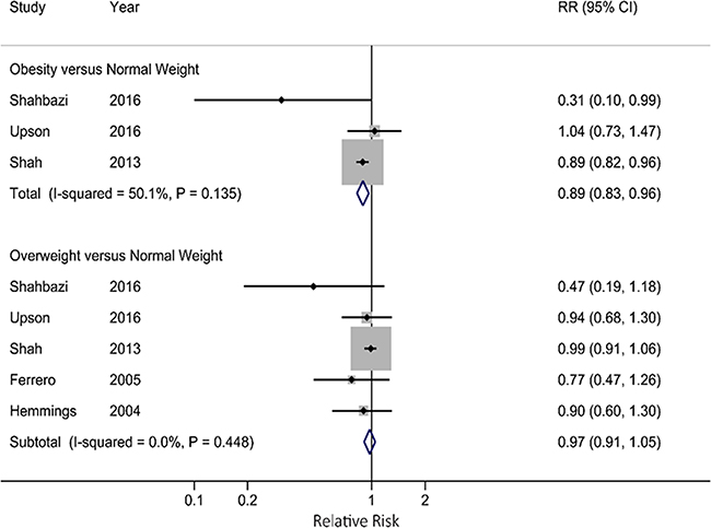 Compared with normal weight women, the pooled RR for obese women was 0.89 (95% CI: 0.83, 0.96), which was lower than that for overweight women (RR=0.97; 95% CI: 0.91, 1.05) (Figure 3). When we stratified by study design, the pooled RR was 0.95 (95% CI: 0.93, 0.98) for cohort studies, which was higher than that for case-control studies (RR=0.59; 95% CI: 0.52, 0.66). When we restricted the analysis in infertile women, the pooled RR was 0.68 (95% CI: 0.51, 0.89), which was lower than that for fertile women (RR=0.75; 95% CI: 0.39, 1.44). When stratified by study location, studies conducted in North America (RR=0.95; 95% CI: 0.92, 0.97), Europe (RR=0.60; 95% CI: 0.49, 0.74) and Asia (RR=0.55; 95% CI: 0.46, 0.65) all showed significantly inverse association between BMI and endometriosis risk. The strength of the associations attenuated when we pooled the studies adjusted for smoking status, length of menstrual cycle, and age at menarche (Table 2). In sensitivity analyses, we recalculated the pooled RRs by sequentially excluding one study. The eight study-specific RRs ranged from a low of 0.63 (95% CI: 0.54, 0.73) to a high of 0.69 (95% CI: 0.55, 0.87) after omission of Shah et al. and Moini et al., respectively. The results were similar when the analysis was restricted to the high-quality studies (RR=0.67; 95% CI: 0.49, 0.92).