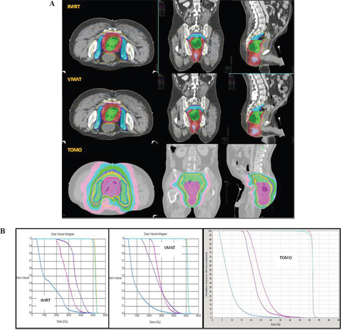 For the comparisons of TOMO to VMAT, TOMO to IMRT and VMAT to IMRT, our results revealed an obvious superiority of CI and HI. With regard to sparing OARs, the TOMO plan was significantly superior to IMRT and VMAT in most of the relevant values for the bladder and femoral heads in the supine position. IMRT and VMAT yielded identical results, indicating that TOMO was superior to IMRT and VMAT in sparing OARs and planning quality parameters.