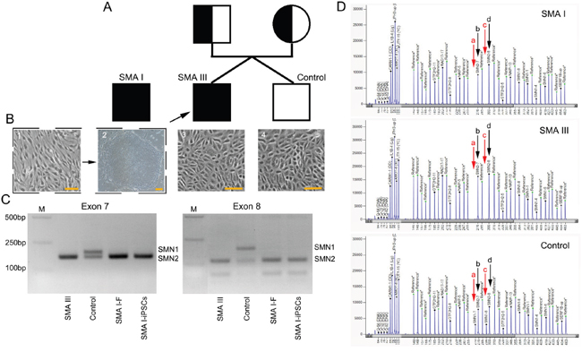 Figure 1: SMN gene mutation screening of cell lines from the three individuals. A. A schematic diagram of the pedigree for iPS cell generation. In addition, iPS cells from a SMA I patient outside of the pedigree were used in the current study. B. Cell lines from the three individuals: iPSCs reprogrammed from fibroblasts (1-2, the SMA I patient), and primary culture of urine cell (3-4, the SMA III patient and healthy control). Scale bar, 100 μm. C. Detection of homozygous deletion of SMN1 gene (exon 7 and exon 8) by PCR-RFLP. D. MLPA results, red arrows- “a” and “c” indicate SMN1 gene (exon 7 and exon 8), black arrows- “b” and “d” indicate SMN2 gene (exon 7 and exon 8).